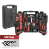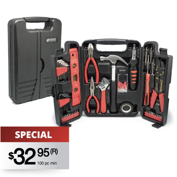 Tool set includes a claw hammer, 6 inch diagonal pliers, 6 inch long nose pliers, 6 inch adjustable wrench, ratchet screwdriver handle, 8 inch crimping tool with wire cutter, box cutter, 9 in leveler, 4 precision screwdrivers, blow-molded case, one roll of PVC electrical tape, 8 metric hex key wrenches, 8 imperial hex key wrenches, 80 piece fastener kit, and 20 ratchet screwdriver bits.