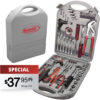 141 pc tool set includes a claw hammer, adjustable pliers, linesman pliers, 6 combination wrenches, 4 precision screwdrivers, 4 Allen wrenches, ratchet driver, 11 ratchet driver bits, ratchet driver bit holder,socket wrench, 17 sockets, socket holder, flathead screwdriver, Phillips screwdriver, utility knife, PVC tape, 90 assorted fasteners, and a durable carrying case.
