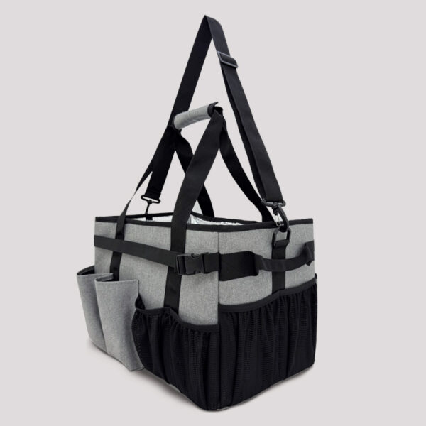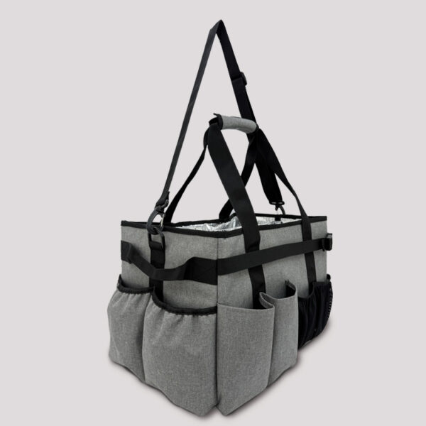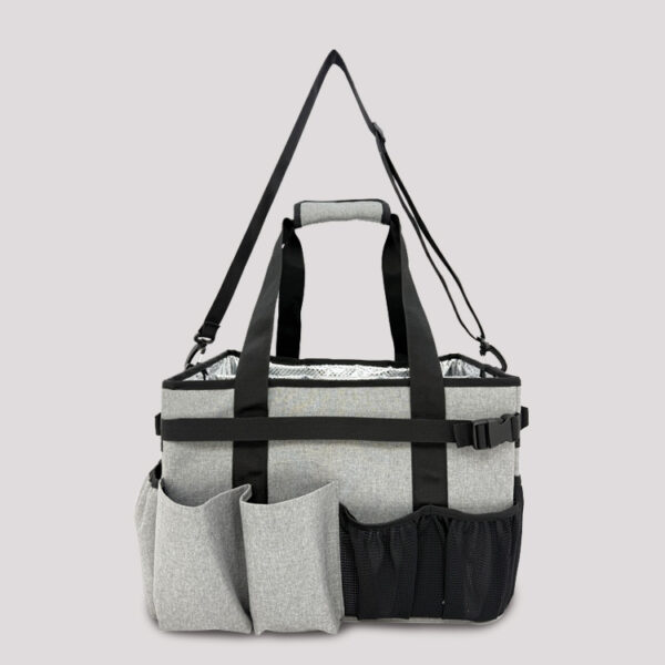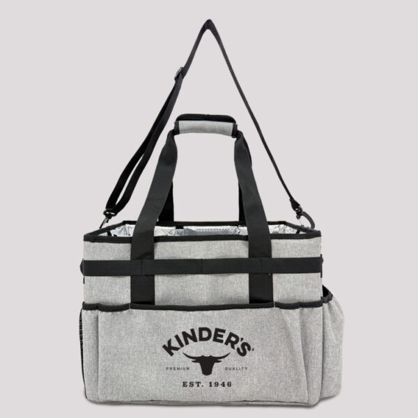 The BBQ Grill Caddy is a compact, convenient organizer for outdoor gatherings. It keeps all your essentials neatly in one place and is easy to carry and store. Key features: Easy-to-clean aluminum-lined interior with dividers and mesh pockets Exterior pockets and loops for condiments, plates, and grill tools Three carrying options: shoulder strap, long padded handles, side handles Folds flat for compact storage Ideal for picnics, camping, tailgates, and family cookouts Unit Size: 16"W x 11"H x 10.5"D
