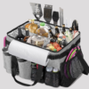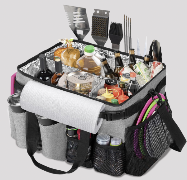 The BBQ Grill Caddy is a compact, convenient organizer for outdoor gatherings. It keeps all your essentials neatly in one place and is easy to carry and store. Key features: Easy-to-clean aluminum-lined interior with dividers and mesh pockets Exterior pockets and loops for condiments, plates, and grill tools Three carrying options: shoulder strap, long padded handles, side handles Folds flat for compact storage Ideal for picnics, camping, tailgates, and family cookouts Unit Size: 16"W x 11"H x 10.5"D