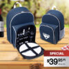 Features 600D polyester fabric with water resistant coating, PEVA insulated cooler lining in main compartment with mesh exterior pocket. Includes 2 sets of stainless steel flatware (spoons, forks, knives), 2 plastic plates and wine glasses as well as one multifunction wine opener.