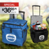 Large Rolling cooler features 600D Polyester fabric with moisture resistant insulated lining with deluxe PEVA fabric throughout. Features: Large mesh pockets on both sides for additional storage. Zippered main compartment. Carrying handles on both sides. Large zippered front pocket. Large slip pocket. Elastic cords on top cover to strap on additional items. Heavy duty telescoping 38" handle with twin wheels on both sides. Includes a removable lined base board to make it sturdier, Lift up base board to fold compact for easy storage. Available Colors: Blue, Black