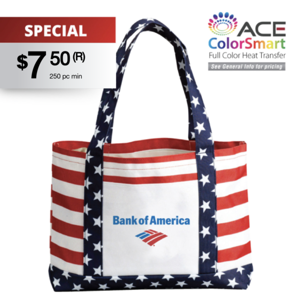 Large carry tote with stars and stripes pattern print. Constructed with 600D polyester. Comes with 23" handles.