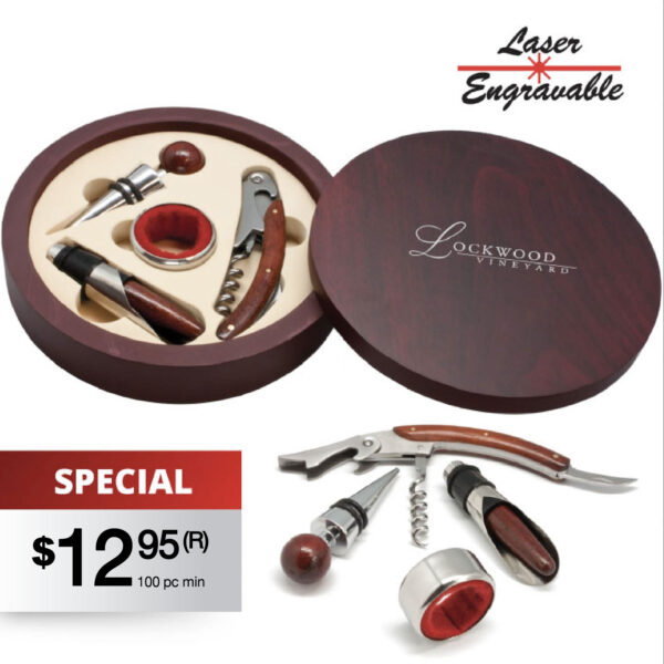 Four piece set includes a 3-function wine bottle corkscrew, classic bottle stopper with rubber grip, a drip ring with felt lining and a wine pourer with rubber ring. Boxed in a traditional style round two-piece cherrywood finish case.