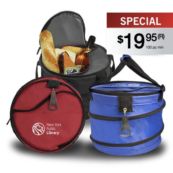 Collapsible Cooler made of Combo: 600D and 210D Polyester, PEVA Lining. 19" Web Carrying Handles with Hook and Loop Comfort Grip. Top Zippered Pocket, Metal Bottle Opener on Retractable Cord. Zippered Main Compartment. Slip pocket on top. Collapsible for easy storage. Spot Clean/Air Dry
