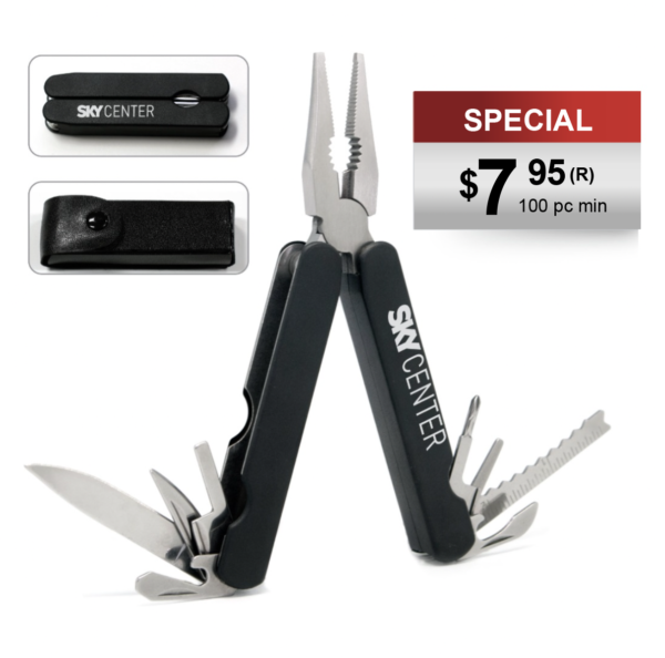 Handy tool features long nose plier, wire stripper, cutter, can opener, phillips/flathead screwdrivers, fish scaler, hook dislodger, ruler, file, knives & bottle opener. Carrying pouch with belt loop included.