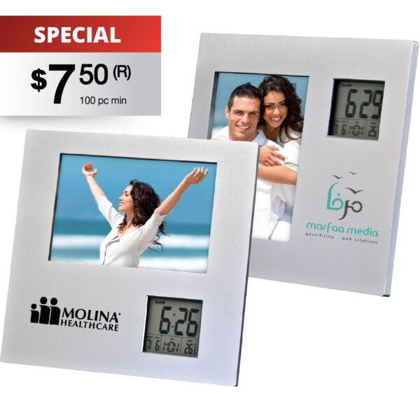 Holds 3 1/2" x 5" photograph horizontally or vertically. Digital clock, calendar & thermometer. Clock display adjusts to face direction of photo. Operates on 2 "AAA" batteries (included).
