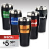 16 oz stainless steel travel tumbler. Push top spill-proof lid with thumb-slide closure. Stainless steel band outside with plastic liner inside. Fits most automotive cup holders. BPA Free. Bulk packed.