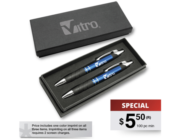 Click action ballpoint pen and mechanical pencil in a deluxe black gift box. Brilliant metallic color barrel with comfort rubber grip. Available Colors: Black, Blue