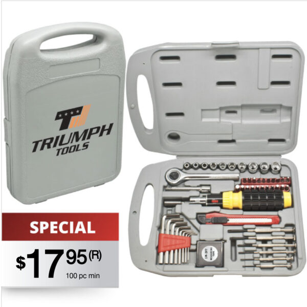 Durable 55 piece tool set includes a ratchet driver, ratchet driver extension, 21 ratchet driver bits, 2 driver bit holders, socket wrench, socket wrench extension, 10 sockets, 8 allen wrenches, allen wrench holder, 6 precision screwdrivers, 3 ft. tape measure, utility knife, and sturdy carrying case.